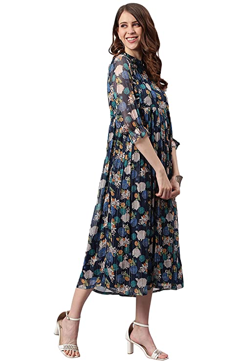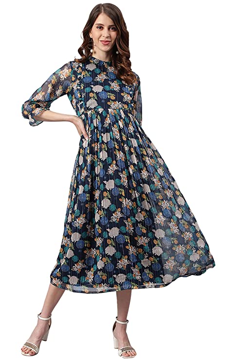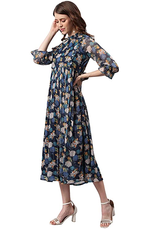 Style:- Length: 48(inch) | Pattern: Floral | Occasion: Casual | Type: Flared | Sleeve Type: 3/4 Sleeve( Puff Sleeve) | Color: Navy Blue