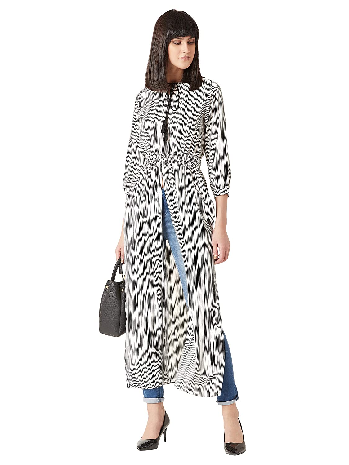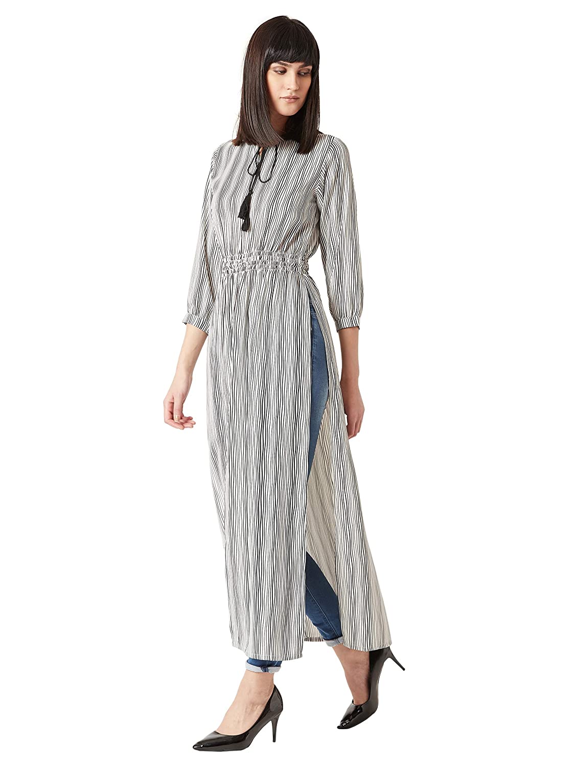 Miss Chase Women’s Multicolored Round Neck 3/4th Sleeves Tie-Up Tassel Detailing Side and Front Slit Maxi Top